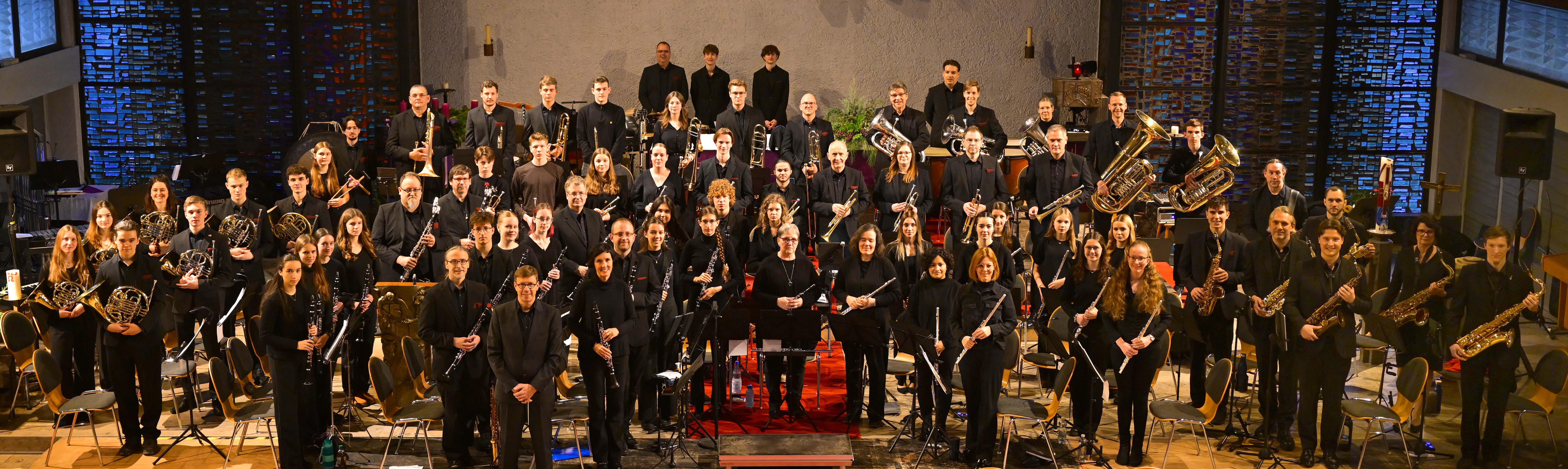 Wir sind ein sinfonisches Blasorchester mit ca. 70 Musikerinnen und Musikern.